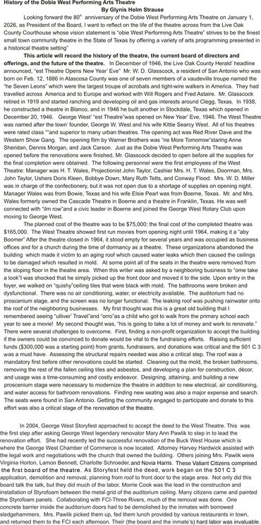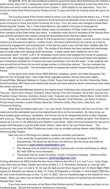 At the Dobie West Performing Arts Theatre, our mission is to enrich the cultural fabric of George West and beyond by providing a vibrant and inclusive space for the performing arts. We are dedicated to nurturing local talent, presenting quality programming, and creating unforgettable experiences that entertain, educate, and empower community members of all ages.
